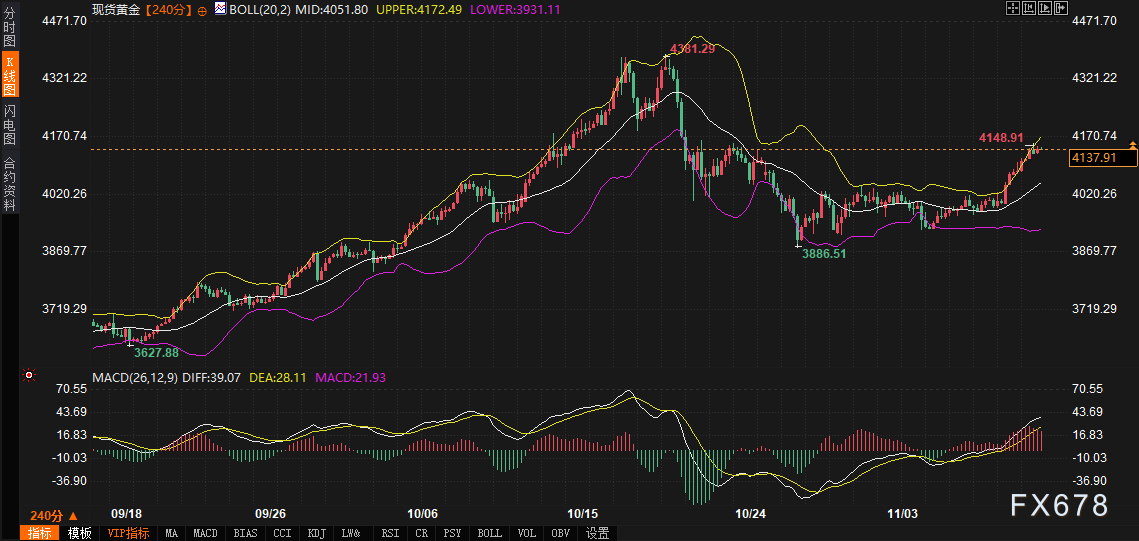 技术层面,美债、美元和黄金的240分钟图表显示出关门尾声的印记,基本面驱动正逐步嵌入价格路径。10年期美债收益率当前报4.116%,日内小幅回落,但布林带(BB 20,2)中轨位于4.109%,上轨4.146%、下轨4.072%,显示价格在中上轨区间震荡,MACD(26,12,9)DIFF为0.005、DEA为0.006,正值虽窄小,却暗示动能偏向上行。这反映了重开预期下的风险偏好修复:关门期间收益率曾因流动性担忧而下探下轨,重开信号已推动其回测中轨,融合了财政支出重启的供给压力。技术派观点认为,此区间内,美债收益率的突破将直接锚定美元路径——上轨失守或确认再通胀定价,下轨则暴露数据疲软风险。