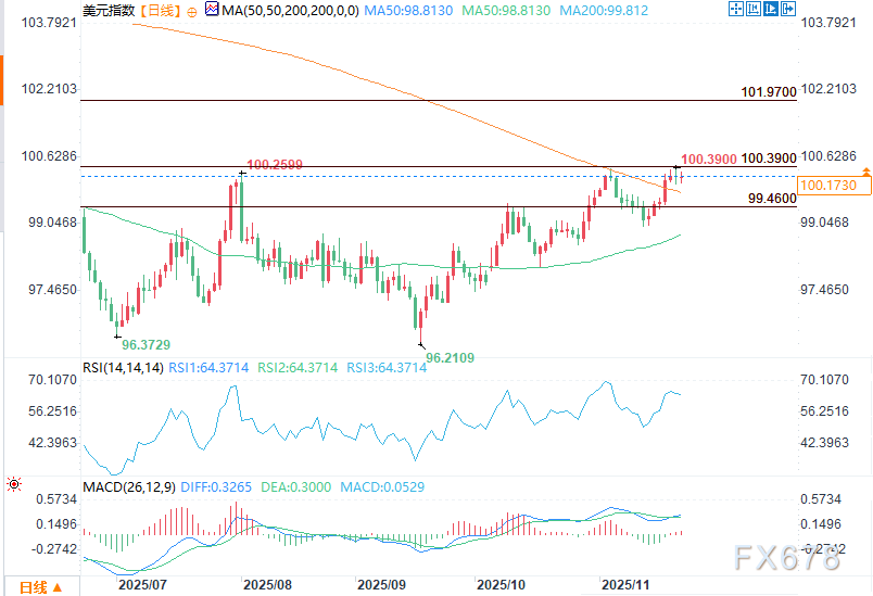 欧元兑美元升至1.1552,此前纽约联储主席约翰·威廉姆斯的言论暗示存在降息空间;英镑兑美元持稳于1.3118,等待英国财政预算公布;新西兰元兑美元徘徊在0.5603,交易员为新西兰联储(RBNZ)预期中的降息做准备;澳大利亚元兑美元报0.6454,静待消费者物价指数(CPI)数据发布。这些交叉货币的波动共同压低了美元的整体走势。