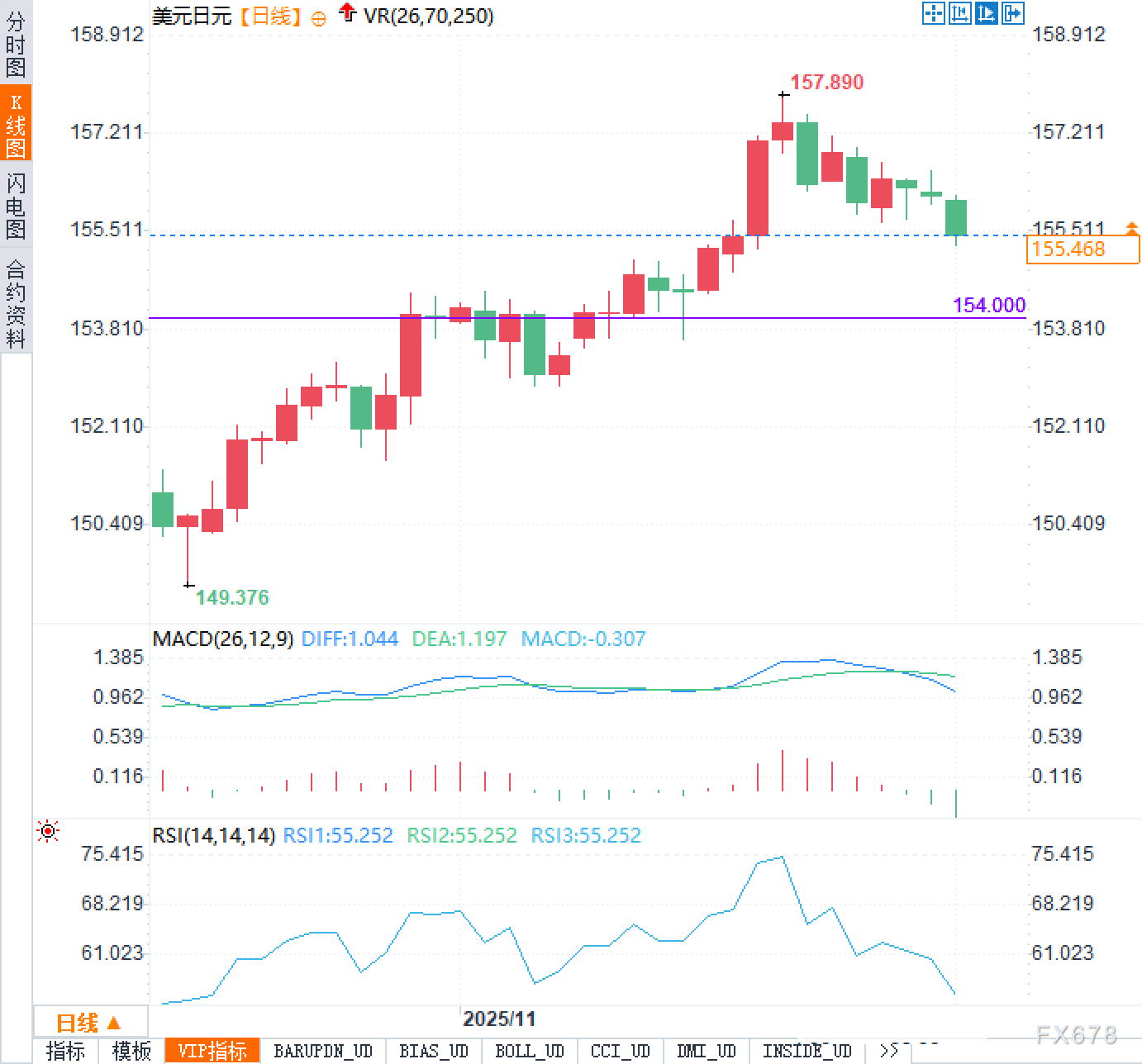 当前美元兑日元于155.50水平附近运行,较前一日高点有所下行,反映出汇率走势正受到来自日本国内政策信号与美日利差变化的双重影响。在全球宏观经济数据密集发布的前夕,交易员正等待更具方向性的宏观线索。
