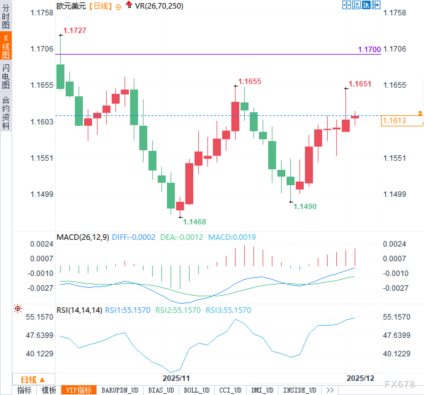 从K线形态观察,汇价在1.1700整数关口下方反复受阻,该位置已形成有效的水平阻力线。近期走势呈现出典型的冲高回落特征:触及1.1655后快速回撤,后再度反弹至1.1651区域即遭空头打压,双顶雏形隐现。下方1.16一线曾多次提供有效支撑,是多头防守的关键区域。