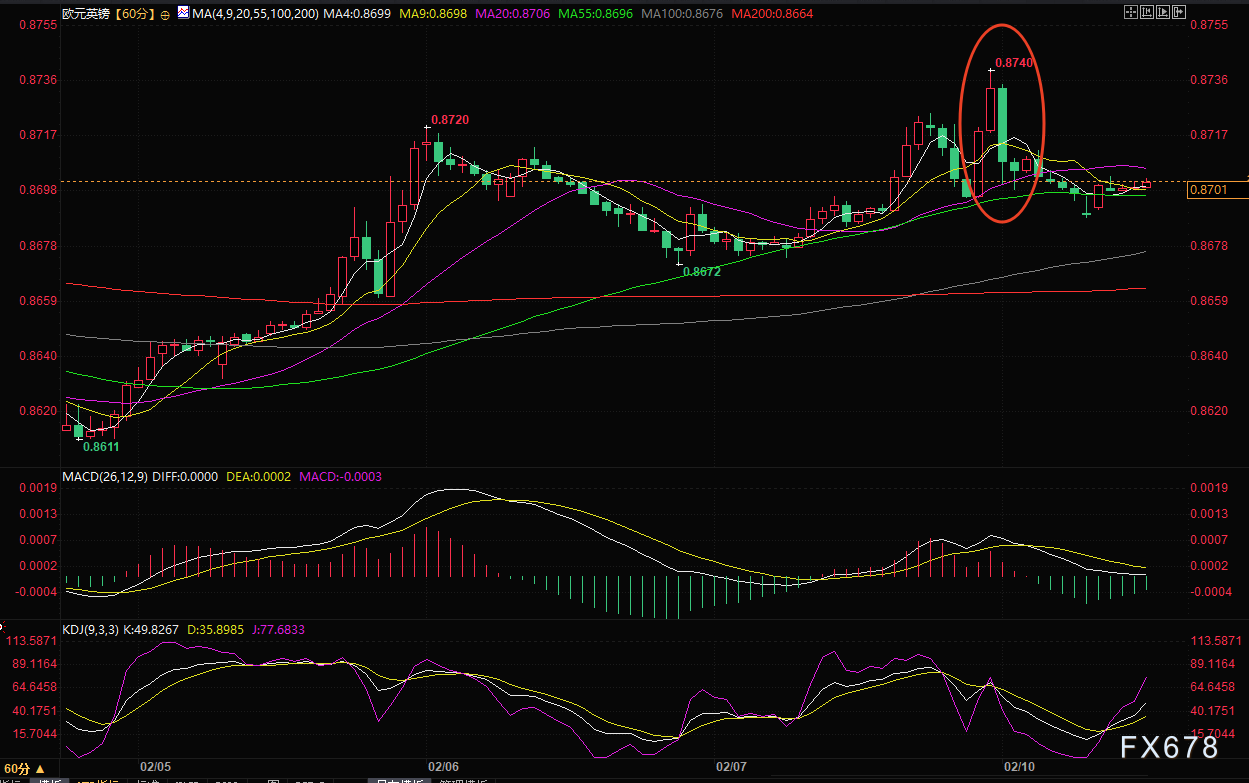 北京时间2月10日11:39 欧元兑英镑 报 0.8701/02。